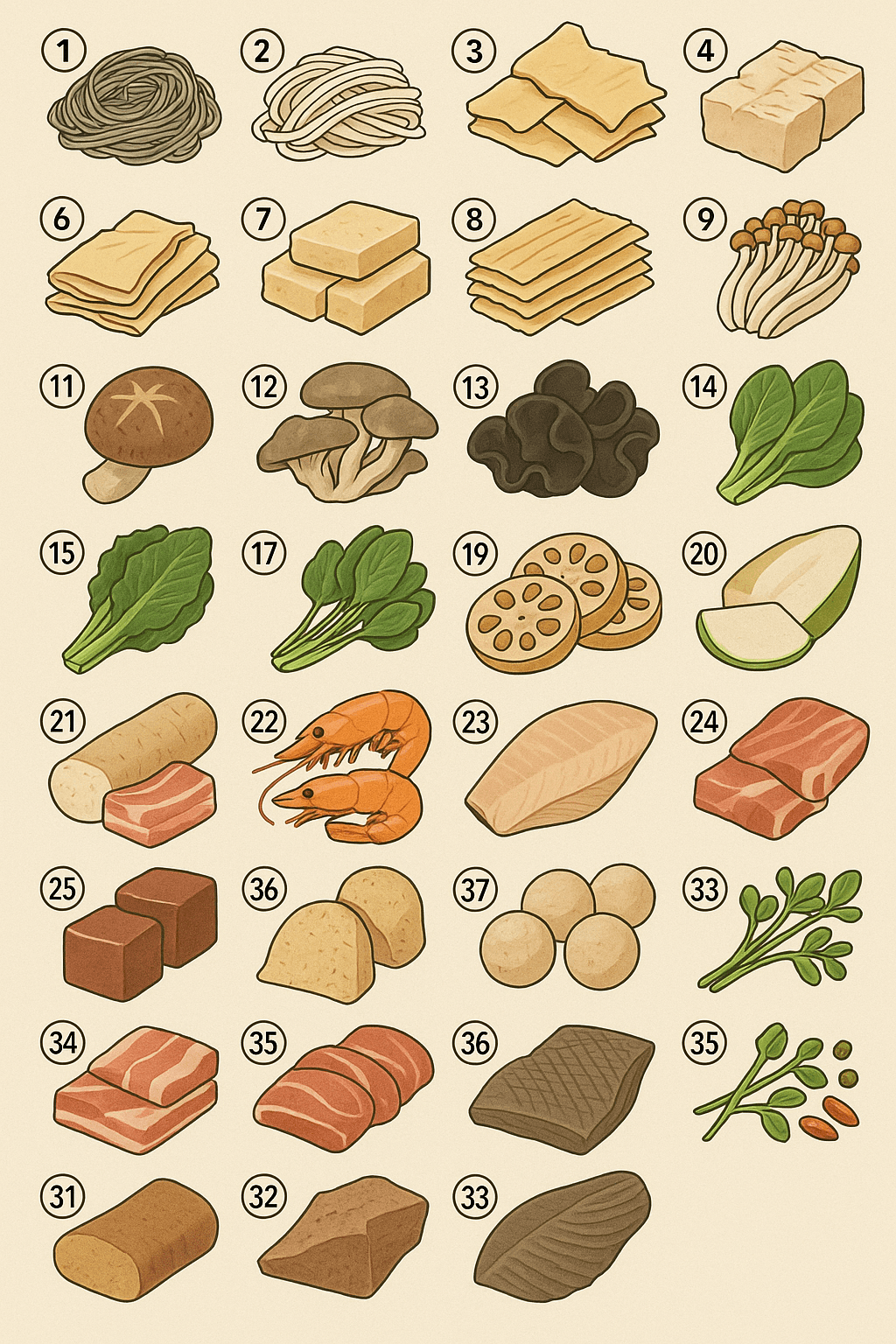 Dieser Artikel ist ein "Wörterbuch", das die Zutaten auf dem Malatang-Buffet-Tisch detailliert erklärt. Zusätzlich zu Geschmack, Textur und Nährwertpunkten stellen wir auch vor, für wen sie geeignet sind und Tipps zum Hinzufügen. Die Reihenfolge ist in sieben Kategorien unterteilt: . Nutzen Sie es sowohl als Lektüre als auch als praktischen Leitfaden mit Ihrem Smartphone in der Hand.